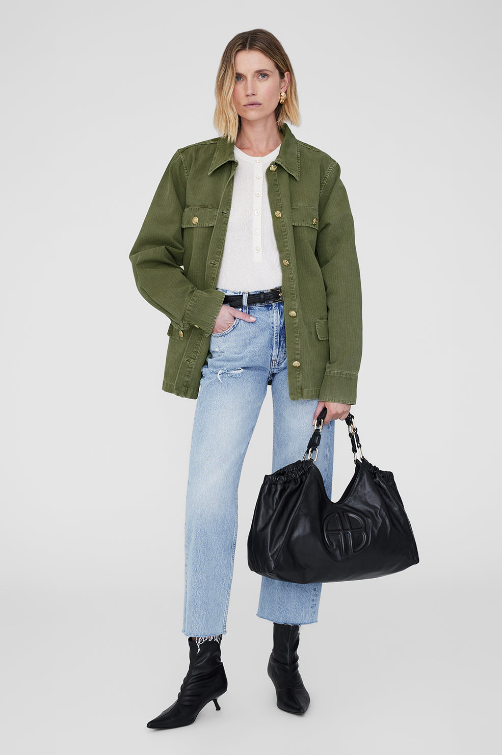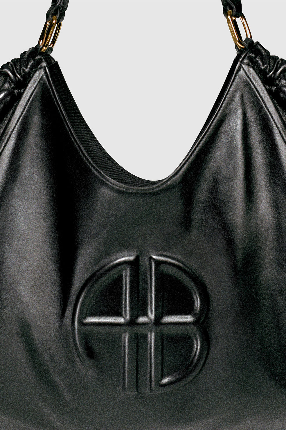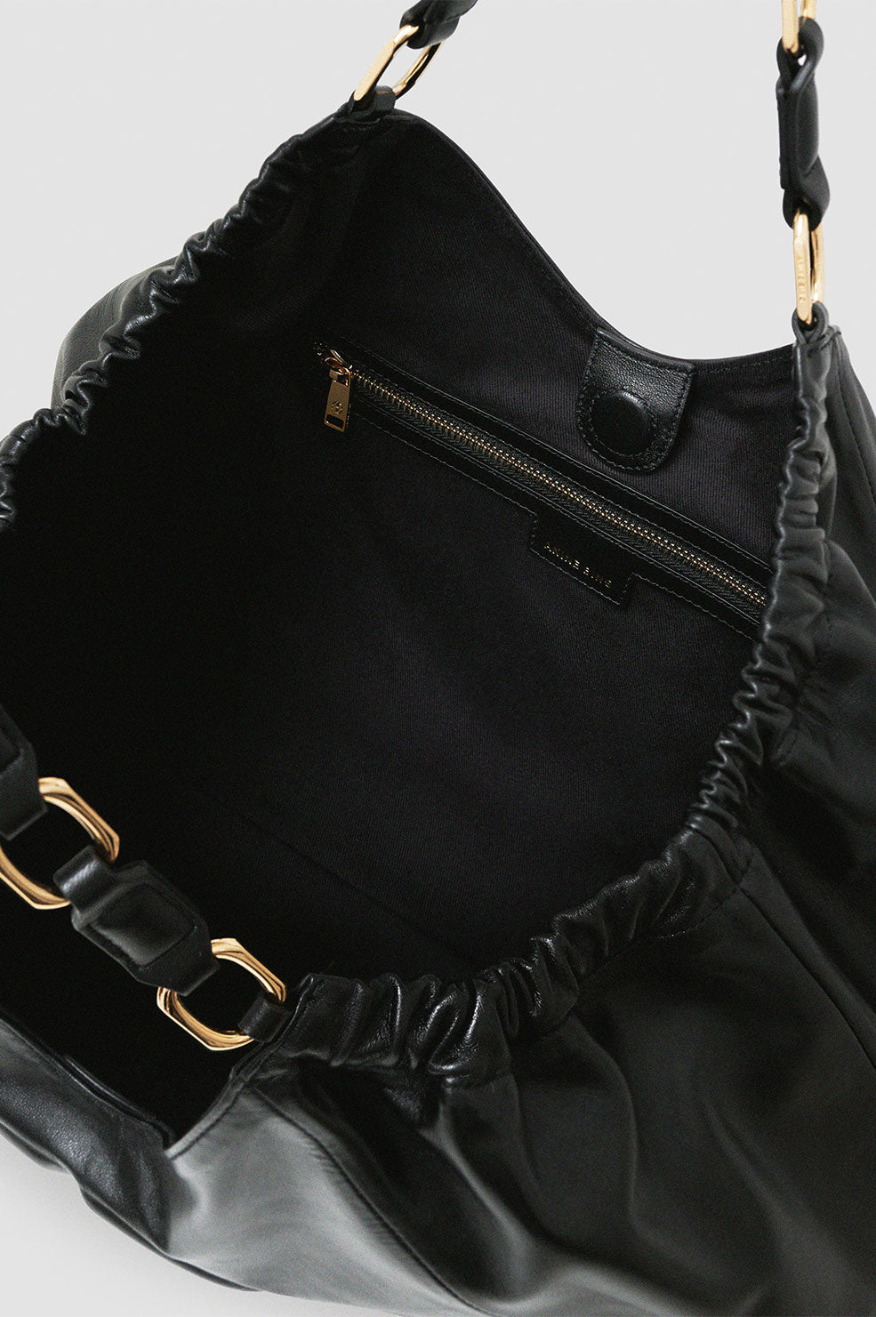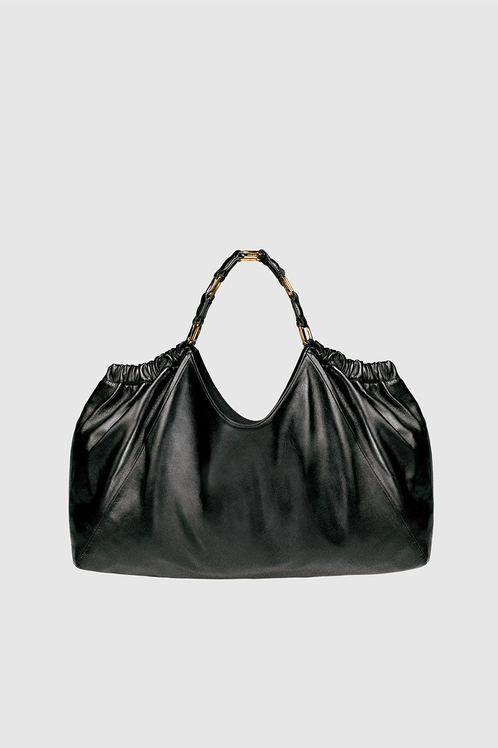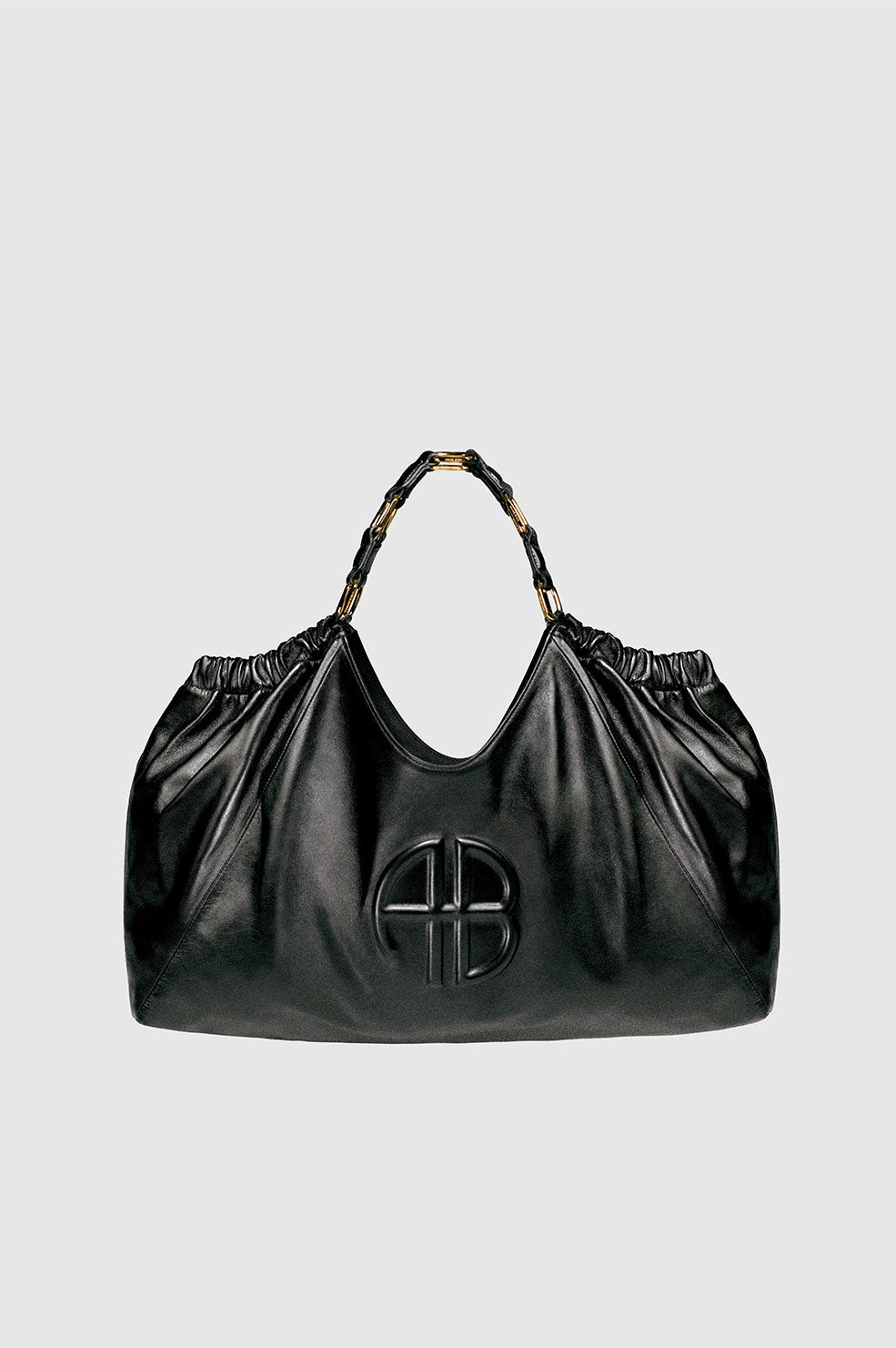• The Medium Kate Tote is constructed from smooth 100% lamb leather. This iconic handbag features straps made of interlocked signature links in gold-tone hardware. Its carryall construction features elastic ruching and a magnetic snap closure to reveal a deep, spacious compartment with a single slip pocket and zipper pocket. Finished with an embossed ANINE BING monogram at the front.