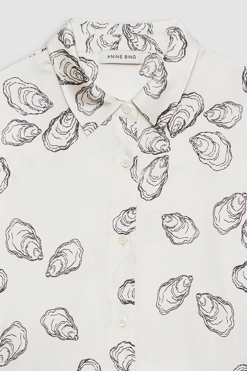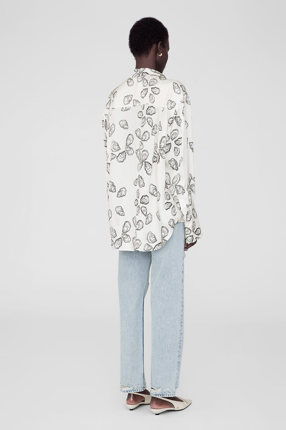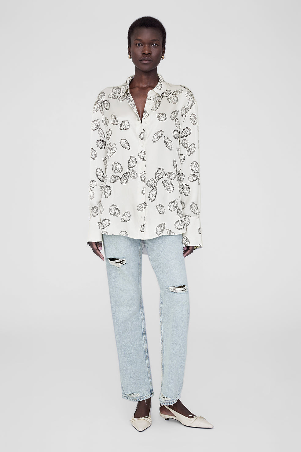 • The Avalon Shirt is an oversized blouse crafted from a light and airy 21 mm double-faced silk charmeuse blend in an abstract oyster print. This flowy separate is finished with mother of pearl buttons down the center-front placket and wide cuffs.