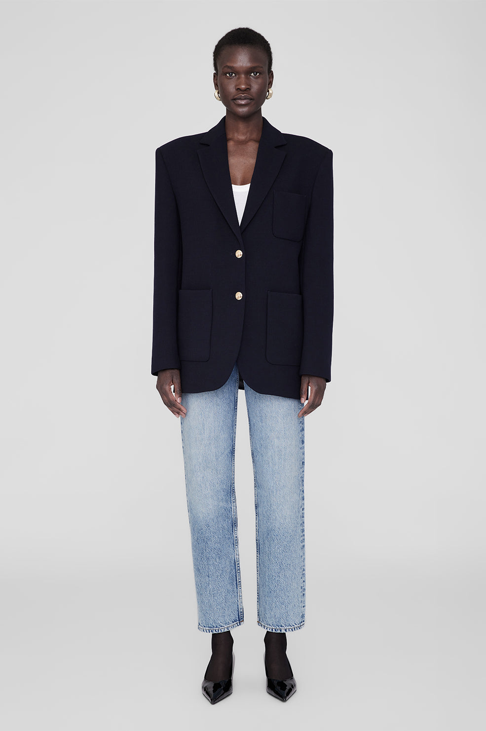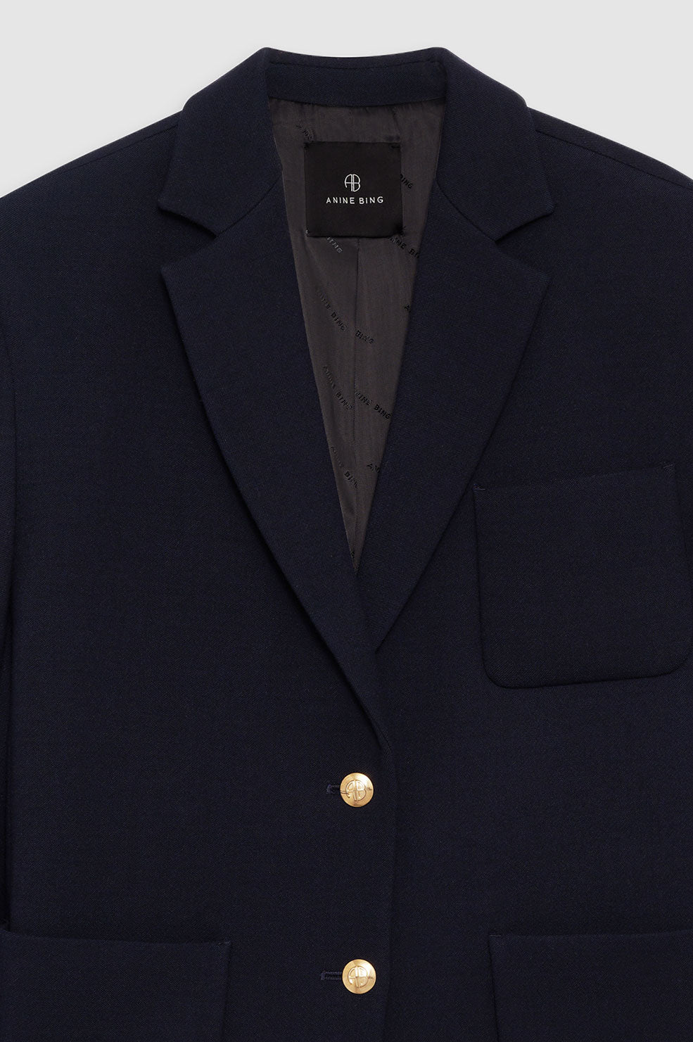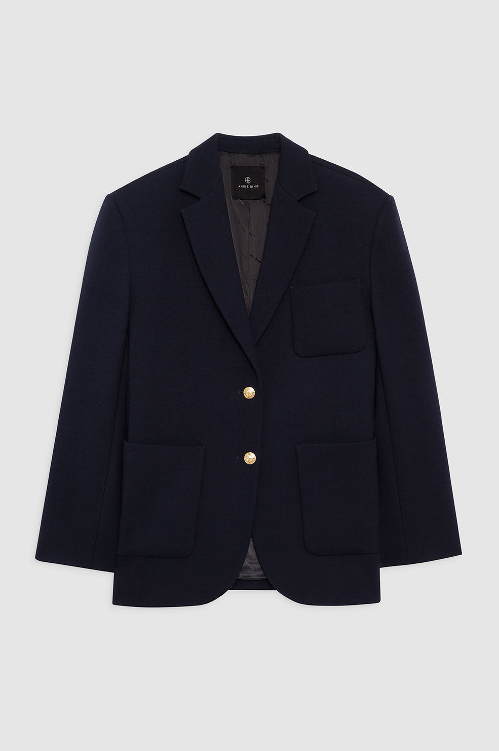 • A constructed club blazer crafted from a heavyweight, dry double-faced wool blend, featuring a classic oversized fit, notched collar, and single-breasted closure with two gold monogram buttons.