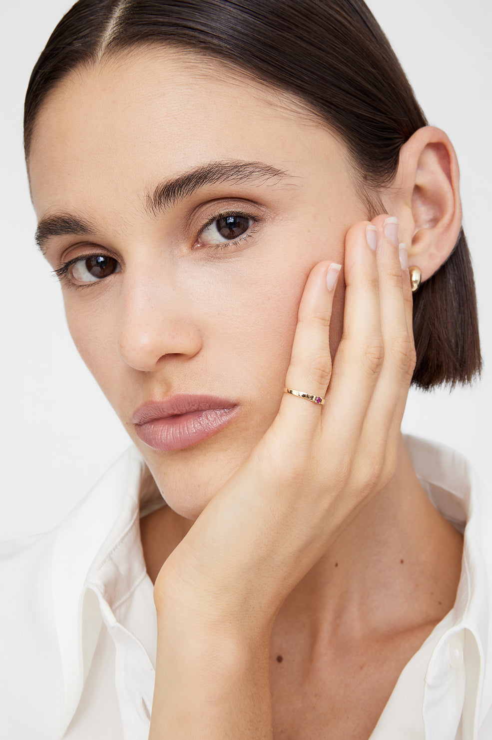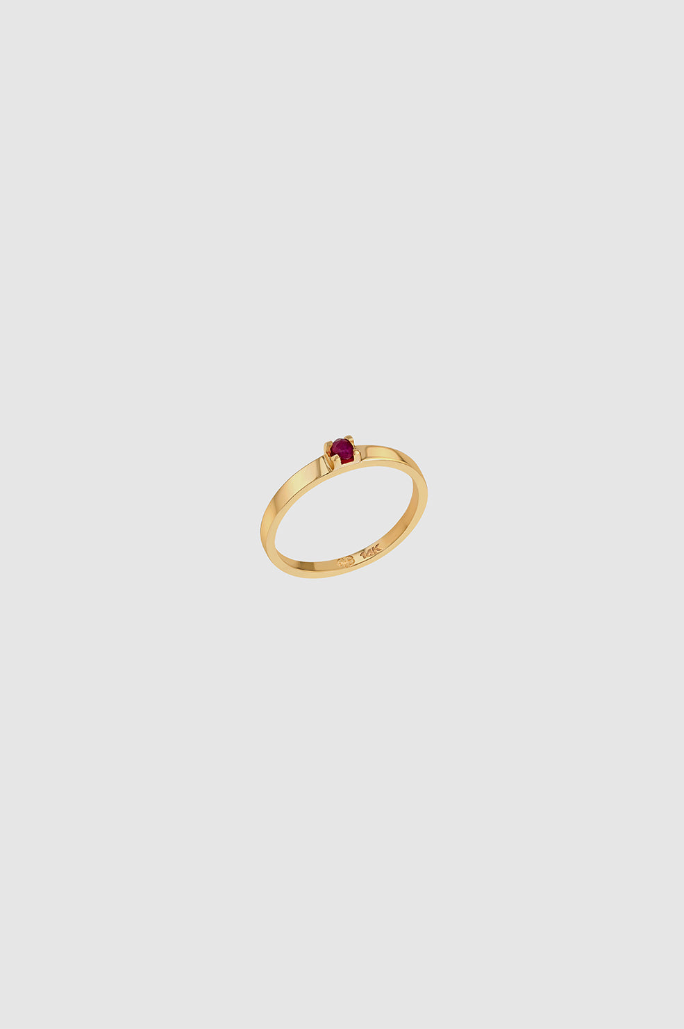 A delicate pinky ring crafted from solid 14k gold featuring a classic band embellished with one ruby stone.
