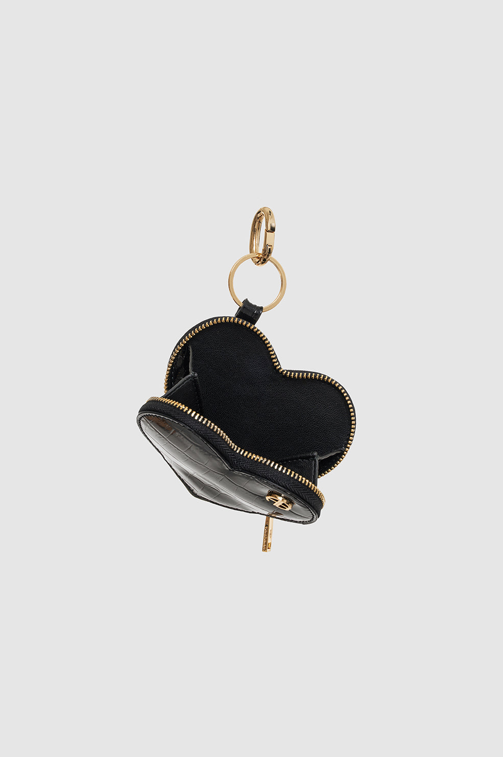 A heart-shaped coin purse made from 100% leather stamped with faux croco-embossed texture in a high-shine finish. This compact, feminine accessory features gold ANINE BING monogram hardware that complements its secure top-zip closure, key ring, and signature link clasp.