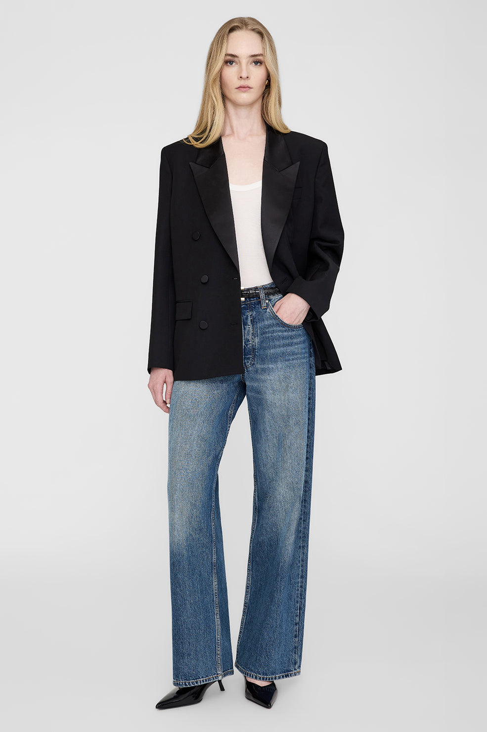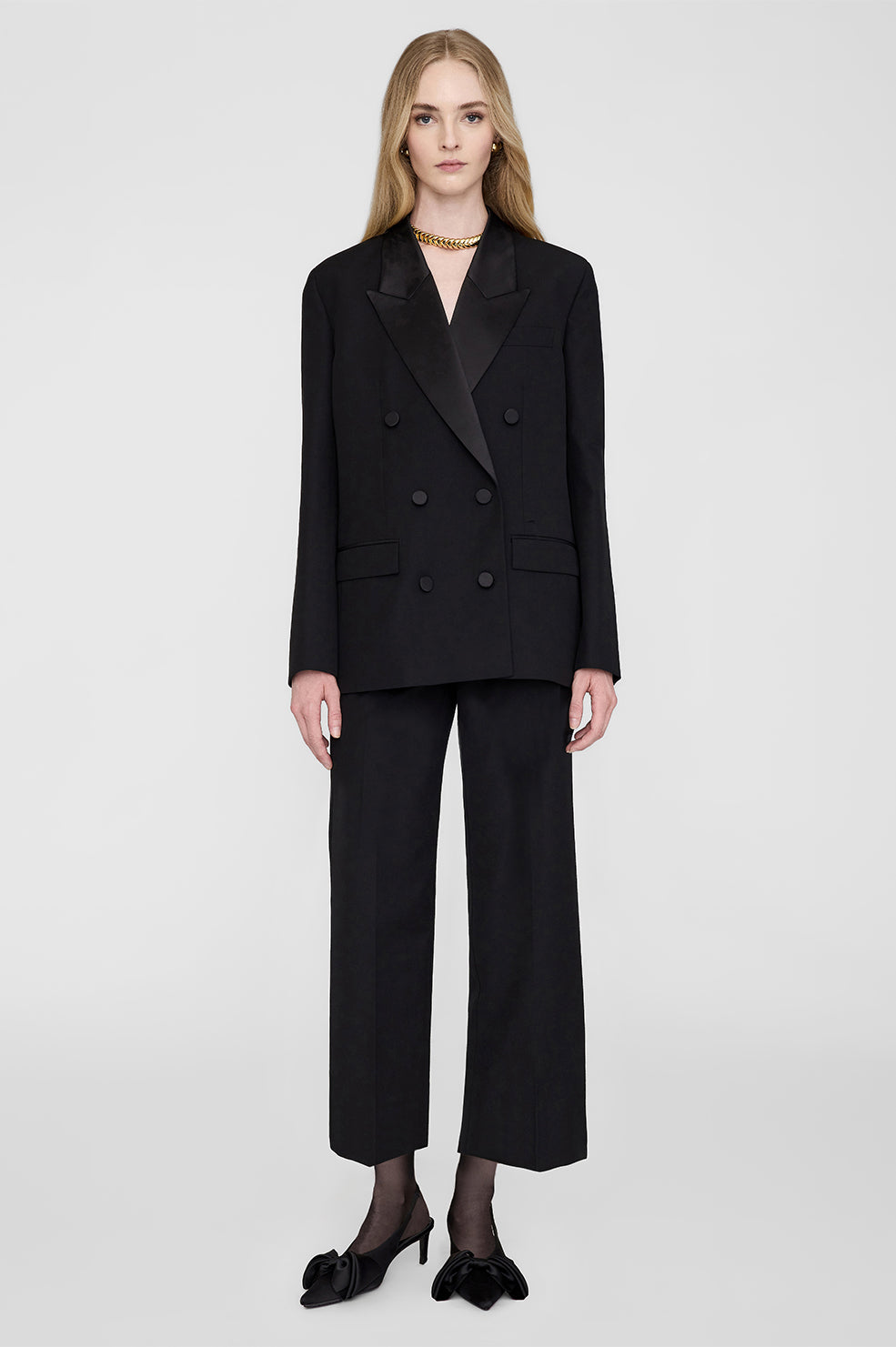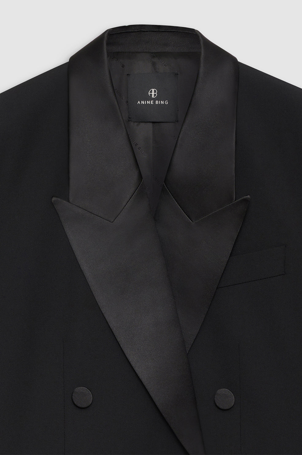 • A fully constructed blazer cut in midweight signature wool, featuring a classic boxy fit, satin peaked lapels, and double-breasted closure with four satin-covered buttons.