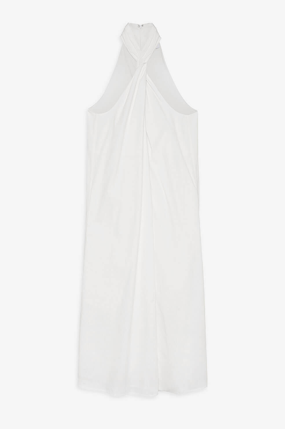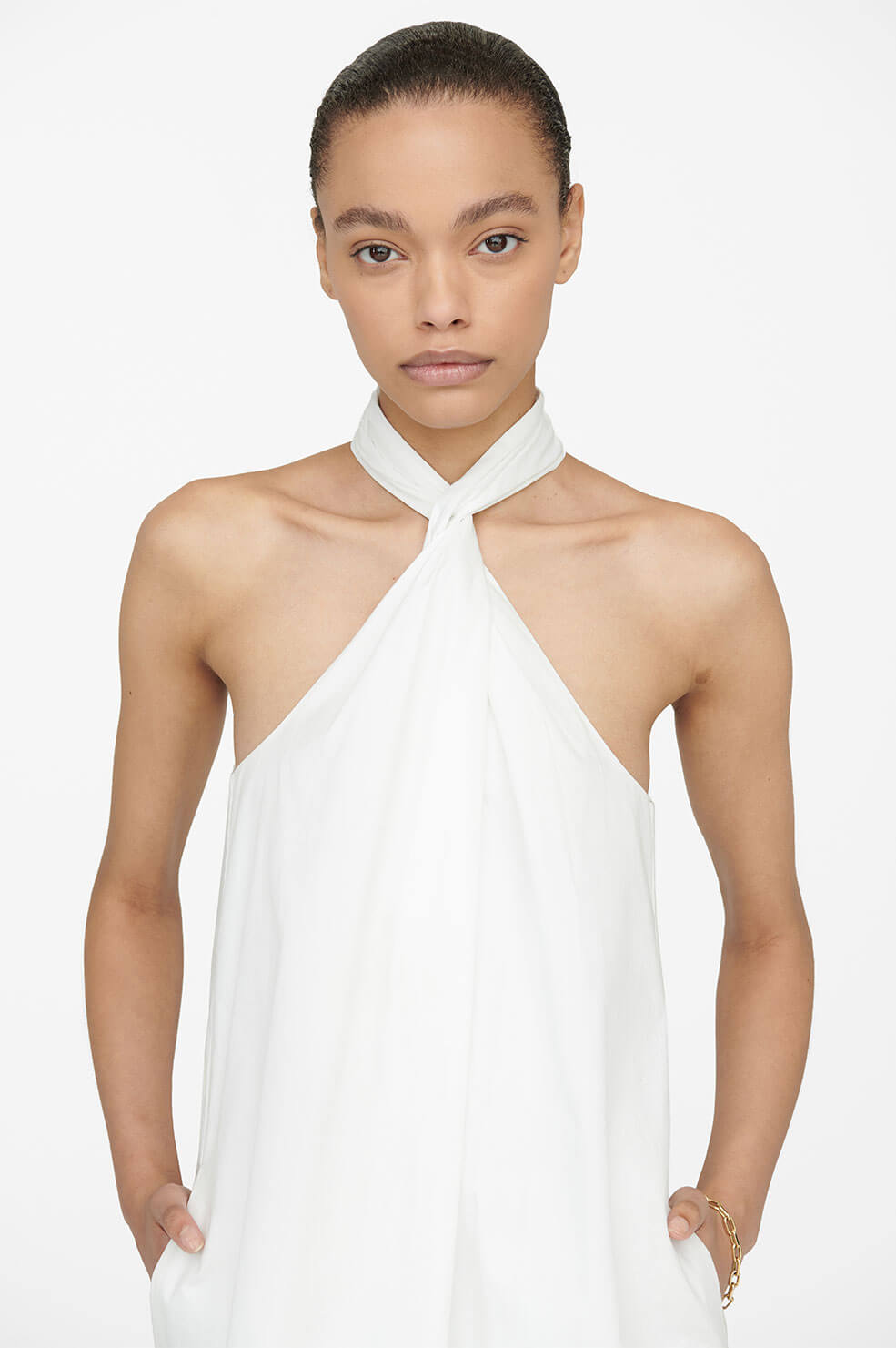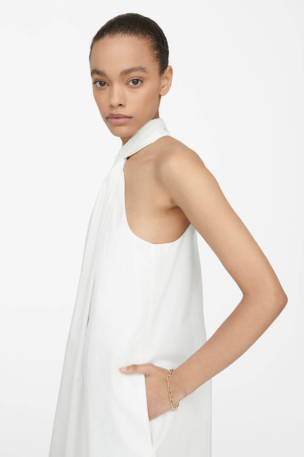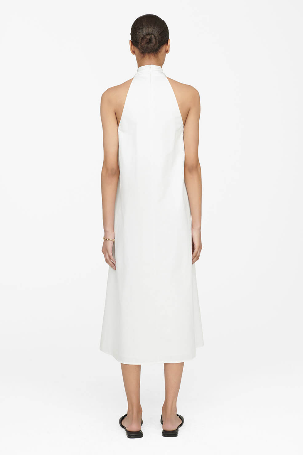 The Cosette Dress is a twist-front, midi dress made from crisp 100% cotton. Its elevated A-line silhouette features an invisible zipper at the back of its high neckline and hidden side pockets for increased functionality.