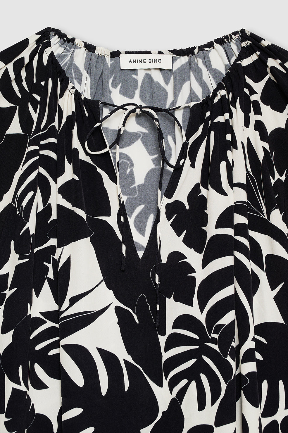 The Lolita Dress is made from a lightweight, 18 mm viscose-silk blend featuring an abstract bird of paradise print.