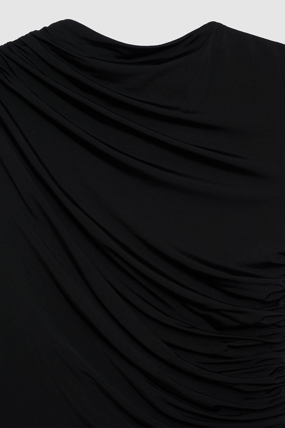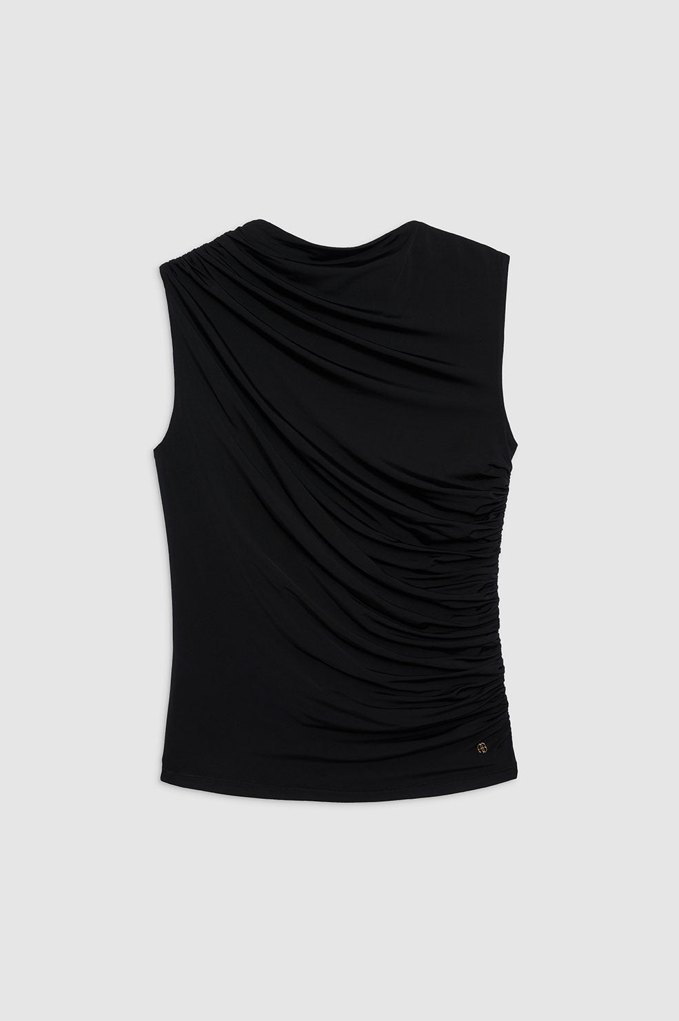 The Lucia Top is made from a sleek and shiny viscose-spandex blend featuring shirring at the shoulder and draping across the wearer's left side. Its fully lined silhouette is finished with an ANINE BING monogram charm at the bottom-left hem.