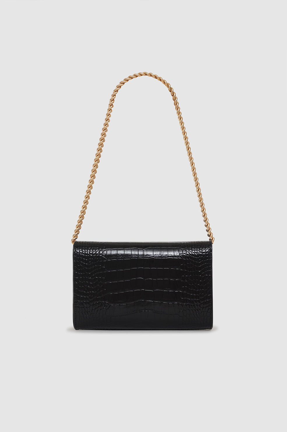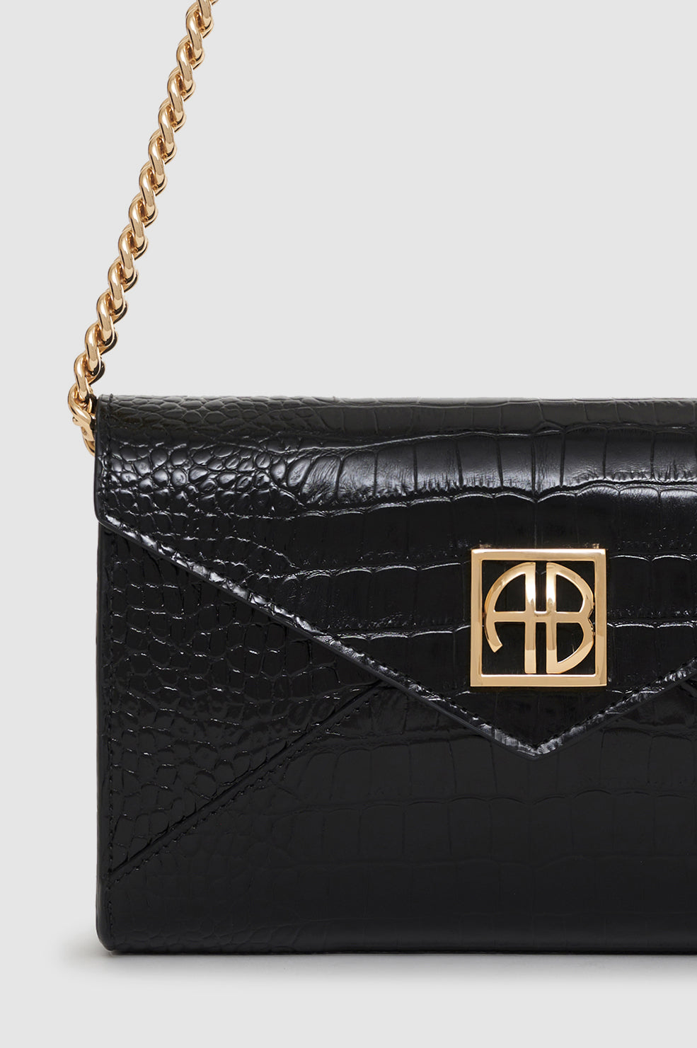 A timeless envelope clutch crafted from 100% leather stamped with faux croco-embossed texture in a mid-shine finish. The Small Elly Clutch features a monogram framed in exceptional gold hardware and a fully lined compartment with an interior slip pocket secured by a custom magnetic snap closure. Complete with a removable, gold curb-chain strap and signature link clasps.