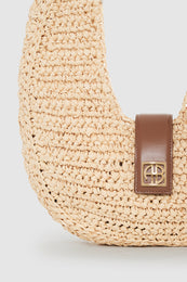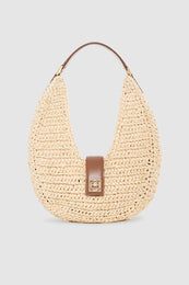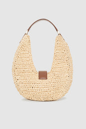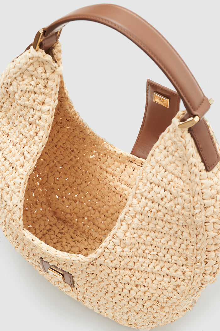 • A seasonal shoulder bag made from a woven seagrass material with cognac leather accents. This item is handmade using natural and artisanal materials. Avoid liquids and moisture to maintain the quality of your product. Do not wet.